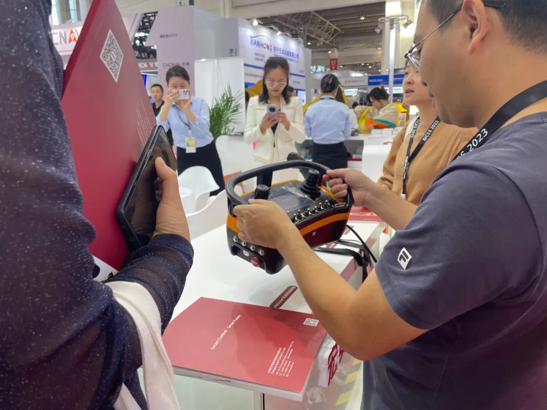 無(wú)人化也是本次展會(huì)的核心之一,在展臺(tái)另一側(cè),多款無(wú)線(xiàn)遙控設(shè)備也得到了客戶(hù)的廣泛關(guān)注。eTelecom系列遙控系統(tǒng),發(fā)射器面板可根據(jù)客戶(hù)的功能需求進(jìn)行非標(biāo)定制,面板可以安裝單軸遙控、雙軸遙控、電位計(jì)、選擇開(kāi)關(guān)、撥動(dòng)開(kāi)關(guān)等。不僅品質(zhì)可靠,并且采用符合人體力學(xué)的腰跨式設(shè)計(jì),在工程機(jī)械、林業(yè)機(jī)械、港口機(jī)械等領(lǐng)域廣泛應(yīng)用。